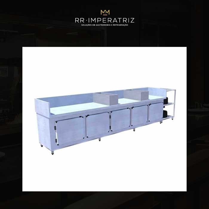 Balcão de serviço 5 portas, sendo 2 portas de 0°c, 2 portas de 5°C e 1 porta de -24°C. Acabamento externo em inox escovado e interno em chapa branca com 1 nível de prateleira de estrados plásticos base em tubo inox. Motores instalados ao lado em suporte de inox com 2 pistas frias sobrepostas no tampo.
