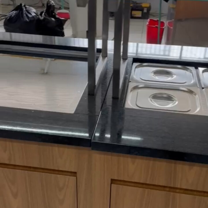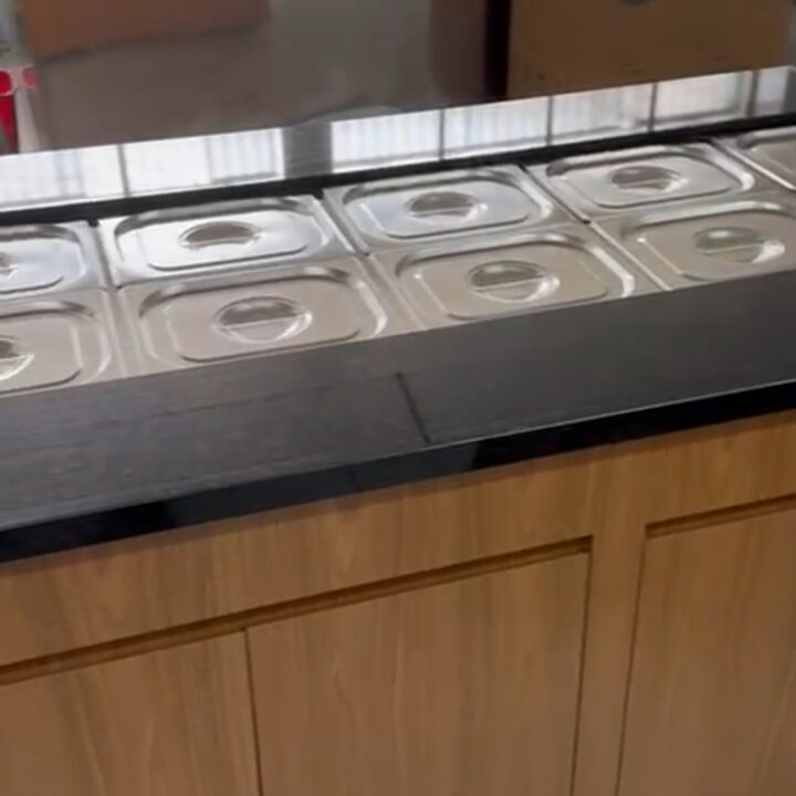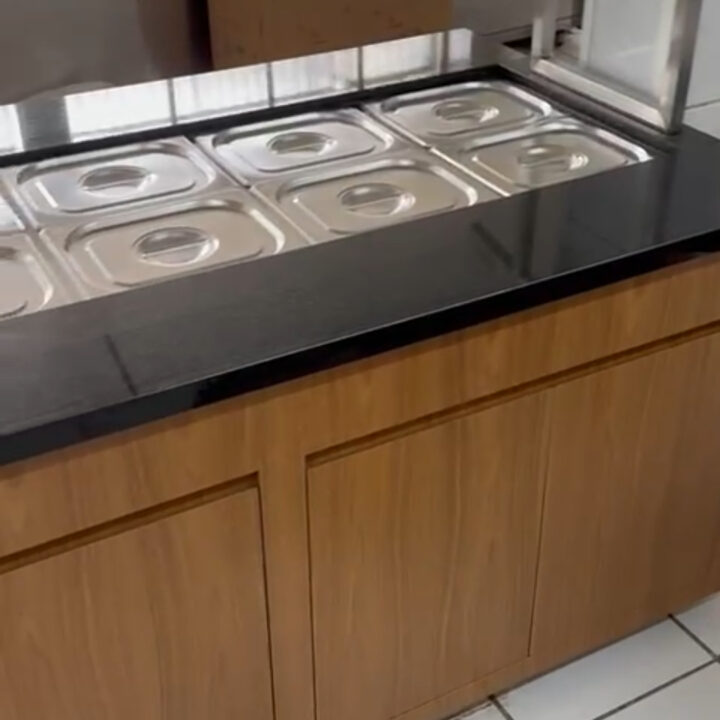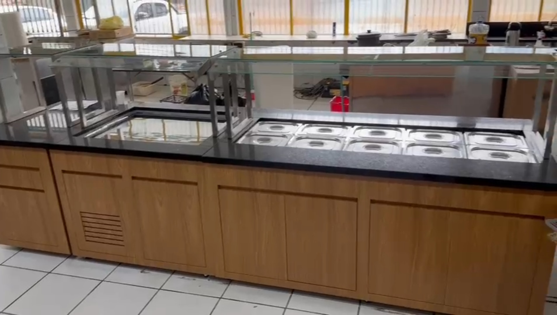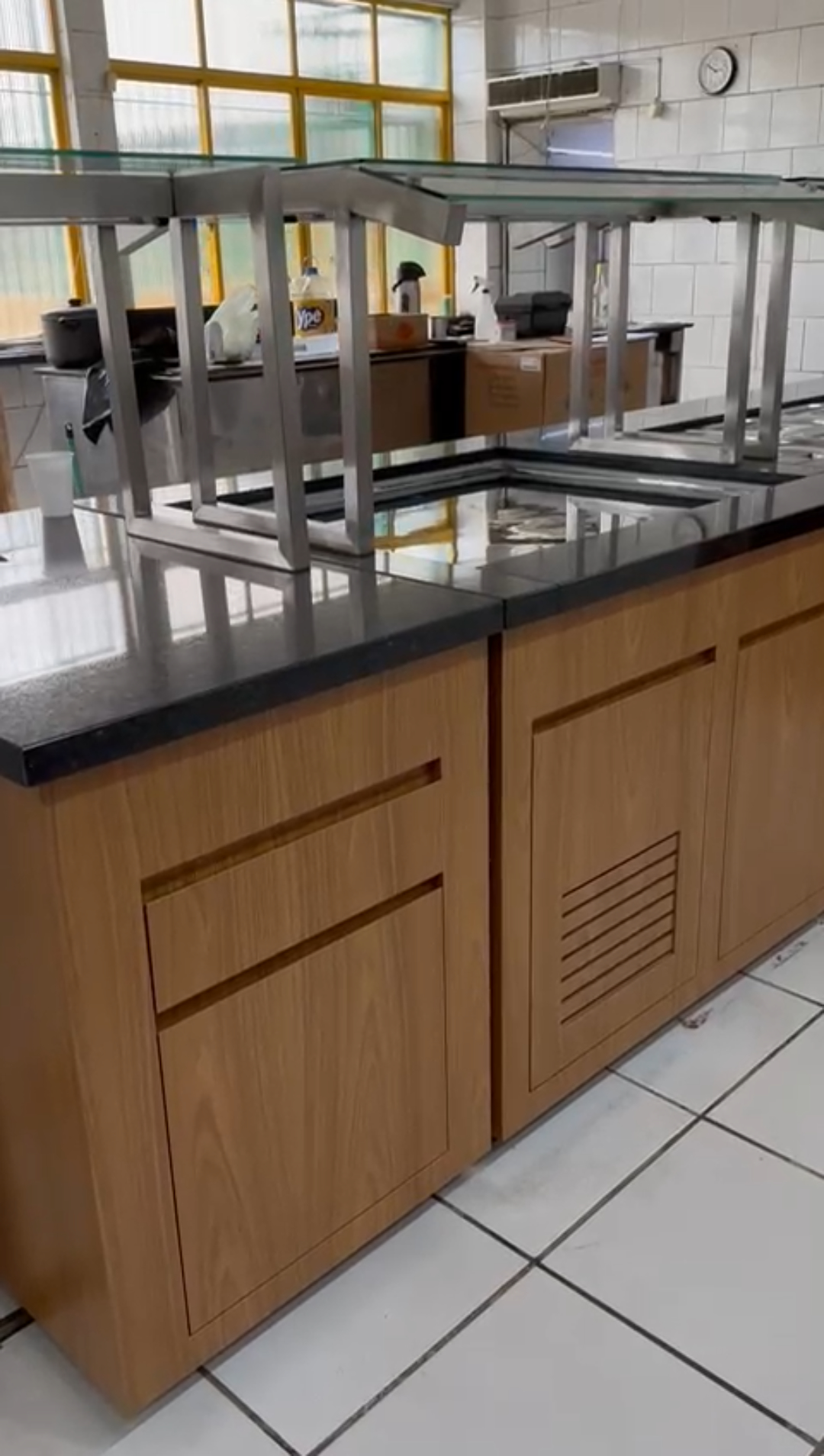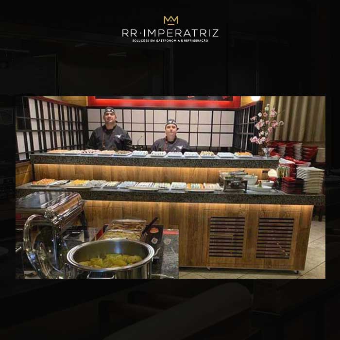 Bancada em ardósia escura. Possuindo módulos para as louças, pista fria e atendendo 10 1/2GNs. O acabamento em madeira com aproveitamento completo do balcão fazendo uso de múltiplas aberturas em ambos os lados do móvel. Um serviço completo que conta ainda com muito espaço para armazenamento de produtos, acessórios e outros.