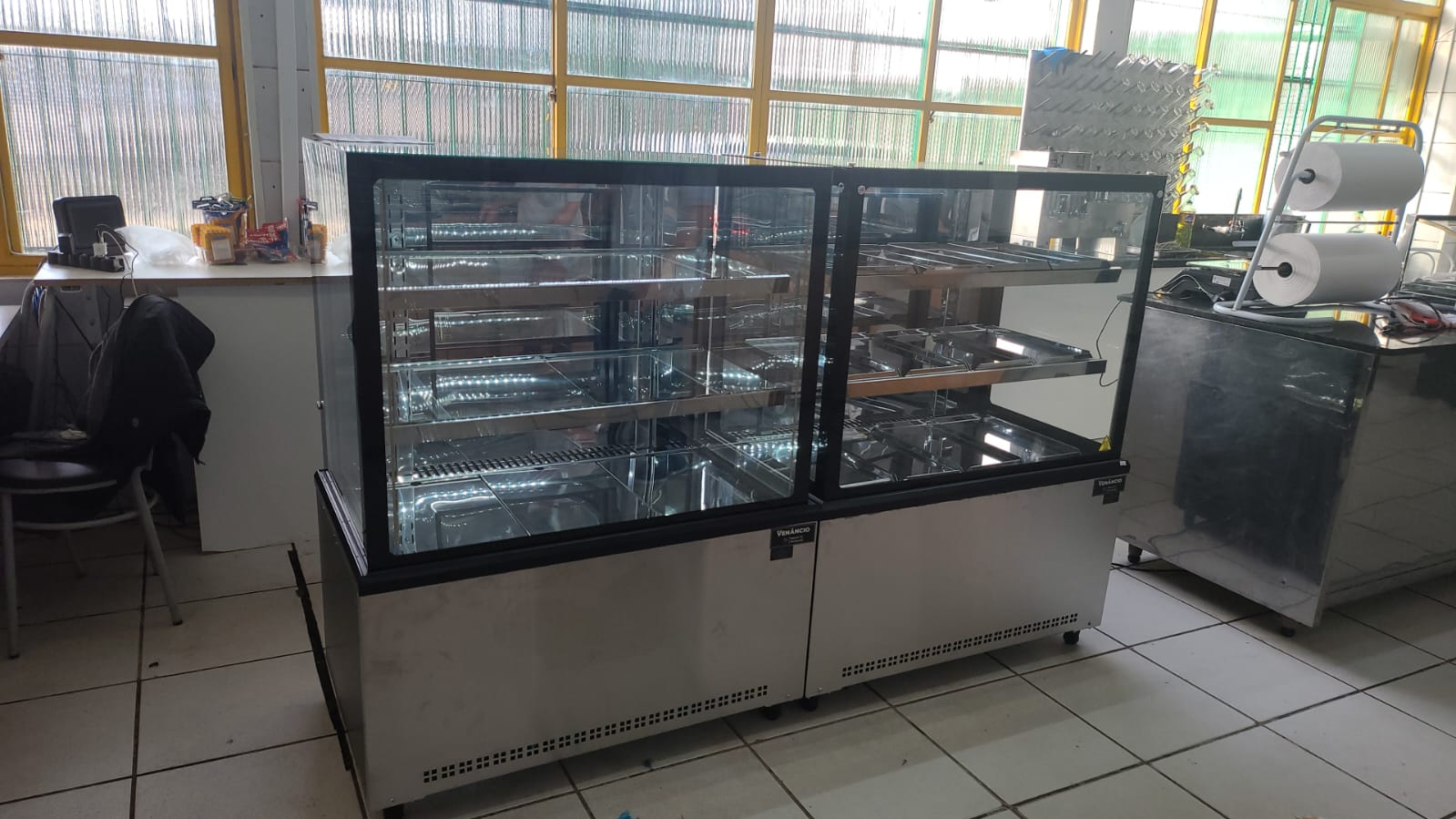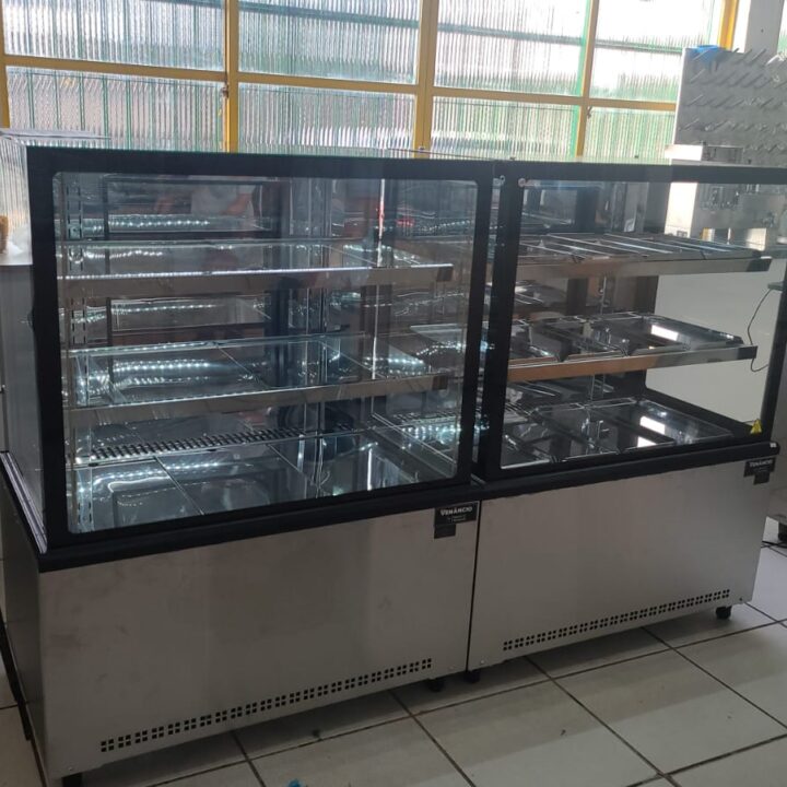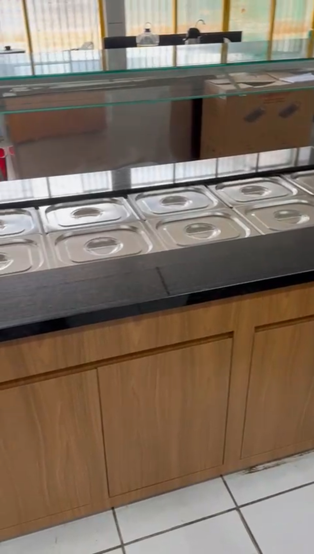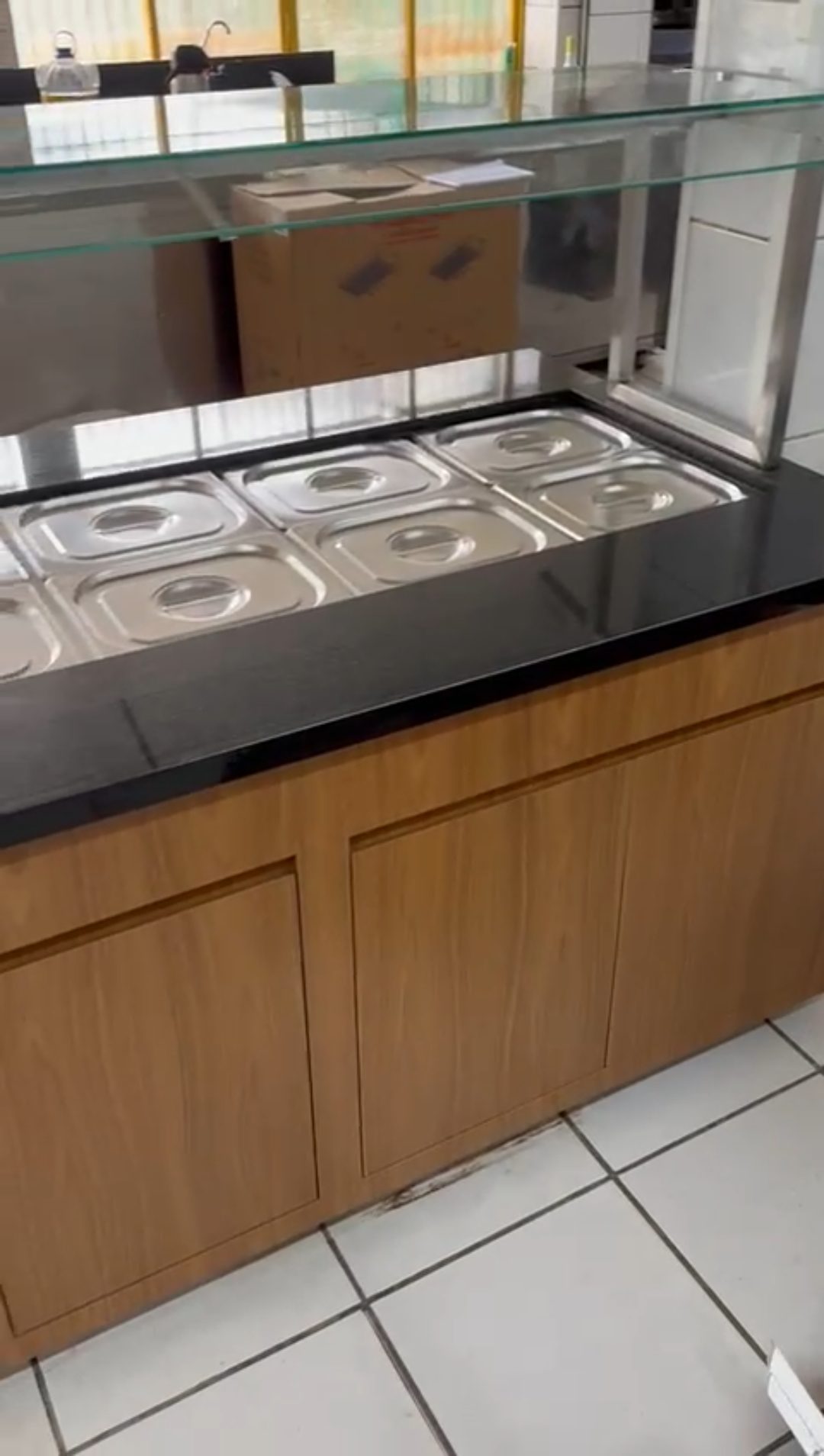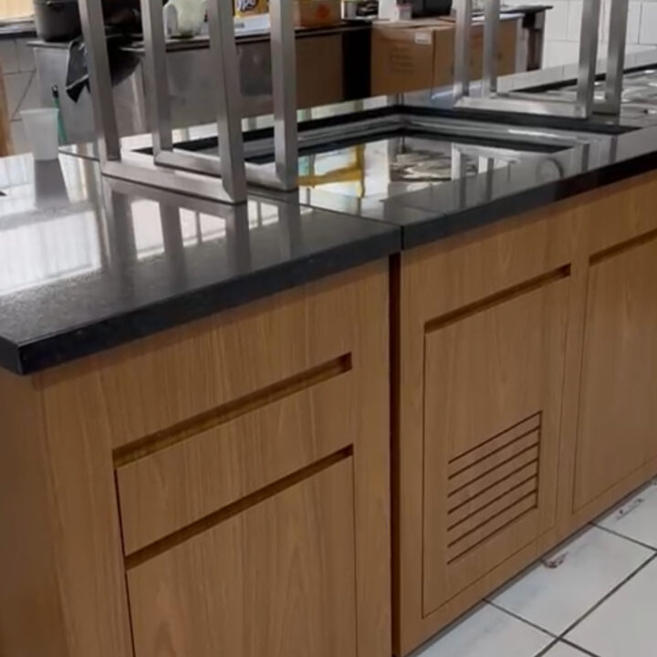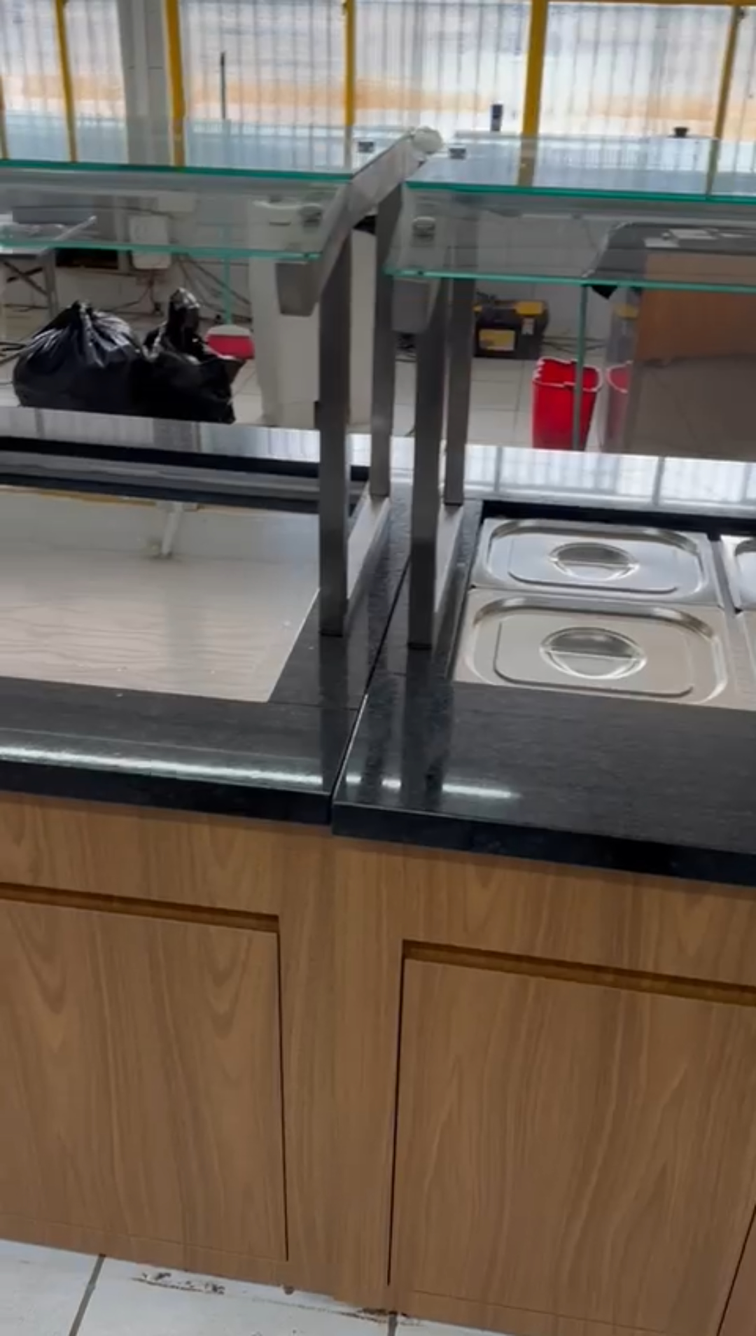 Bancada em ardósia escura. Possuindo módulos para as louças, pista fria e atendendo 10 1/2GNs. O acabamento em madeira com aproveitamento completo do balcão fazendo uso de múltiplas aberturas em ambos os lados do móvel. Um serviço completo que conta ainda com muito espaço para armazenamento de produtos, acessórios e outros.