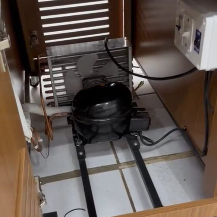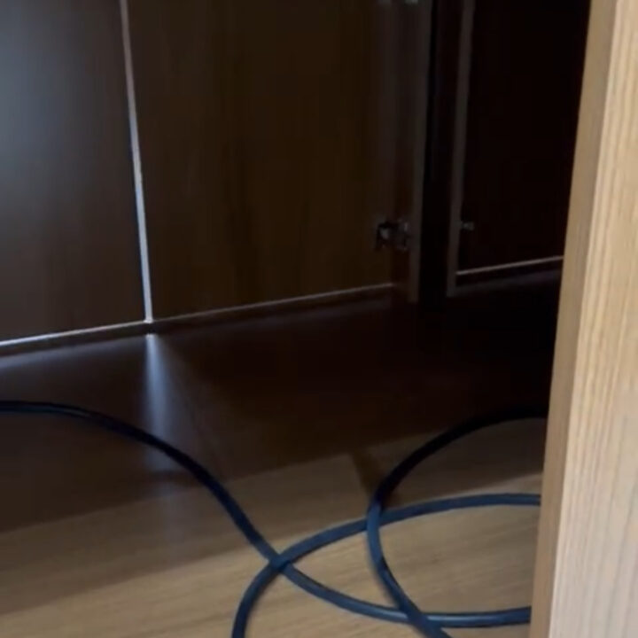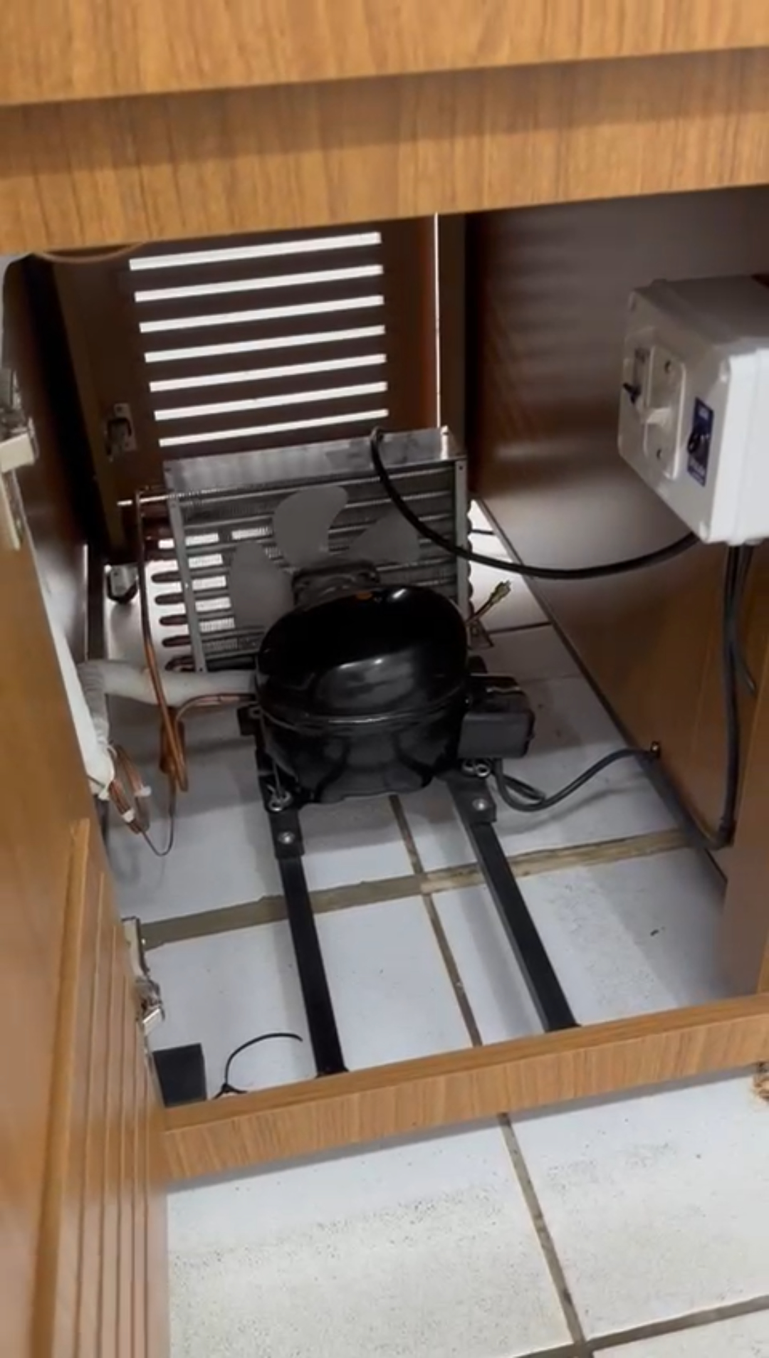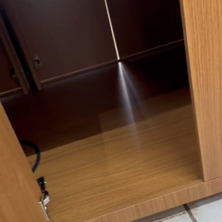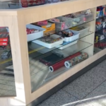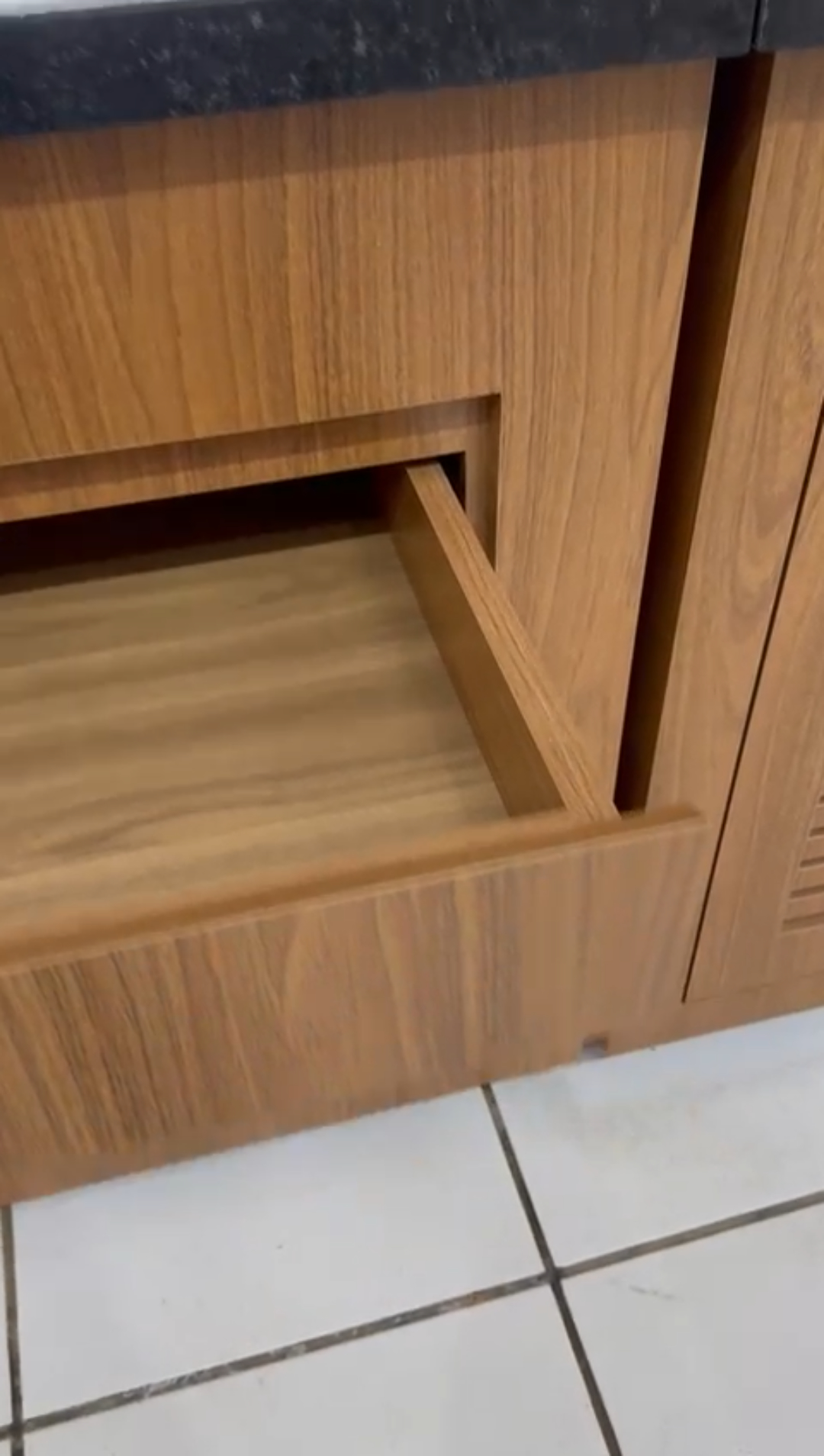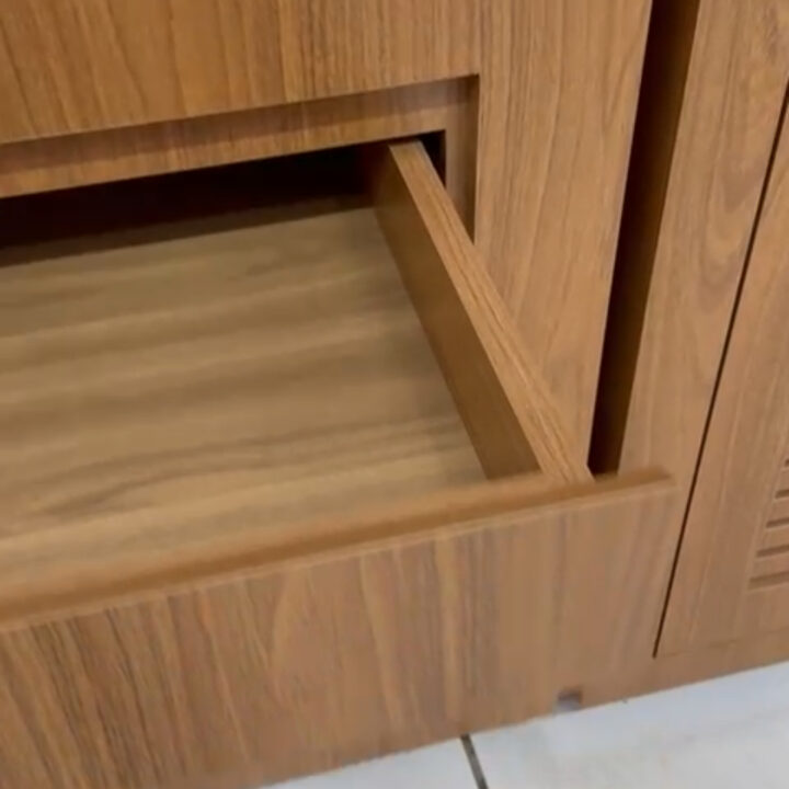 Bancada em ardósia escura. Possuindo módulos para as louças, pista fria e atendendo 10 1/2GNs. O acabamento em madeira com aproveitamento completo do balcão fazendo uso de múltiplas aberturas em ambos os lados do móvel. Um serviço completo que conta ainda com muito espaço para armazenamento de produtos, acessórios e outros.
