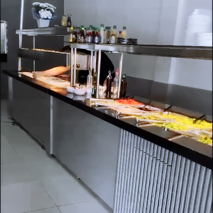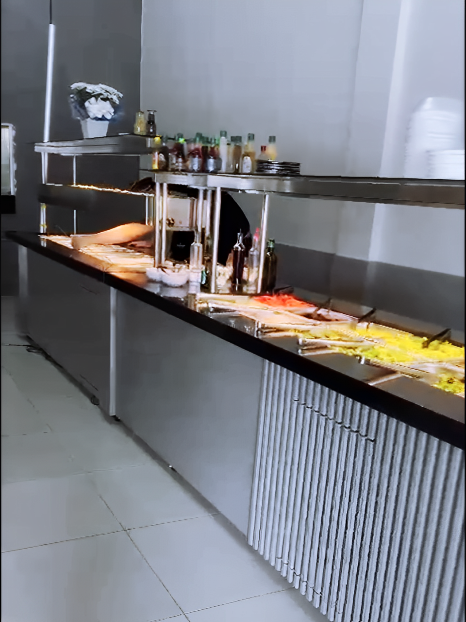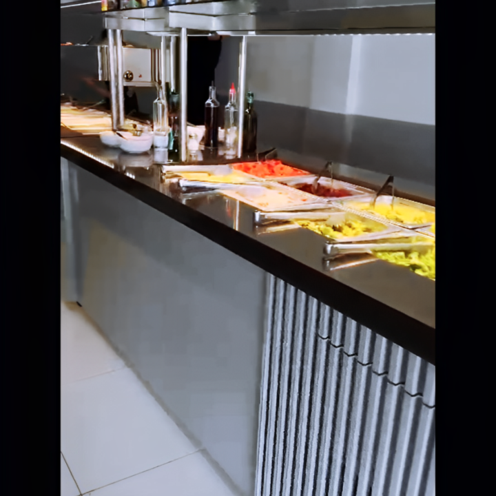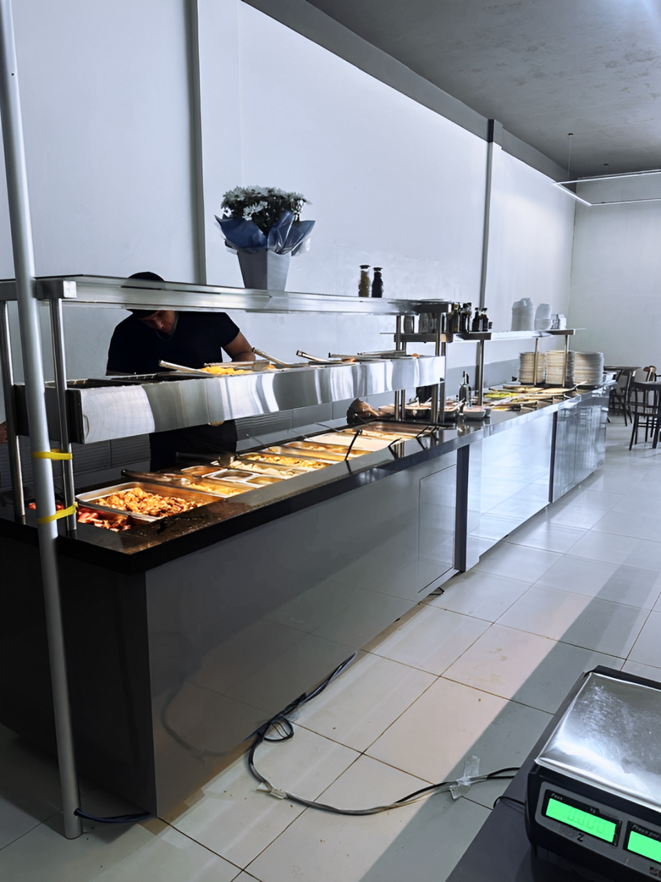 Buffet completo quente e frio, balcão e ardósia, inox e vidro. Sua marcenaria perfeita completa o conjunto. Uma ótima experiência aos clientes