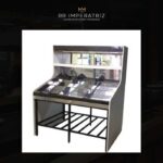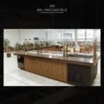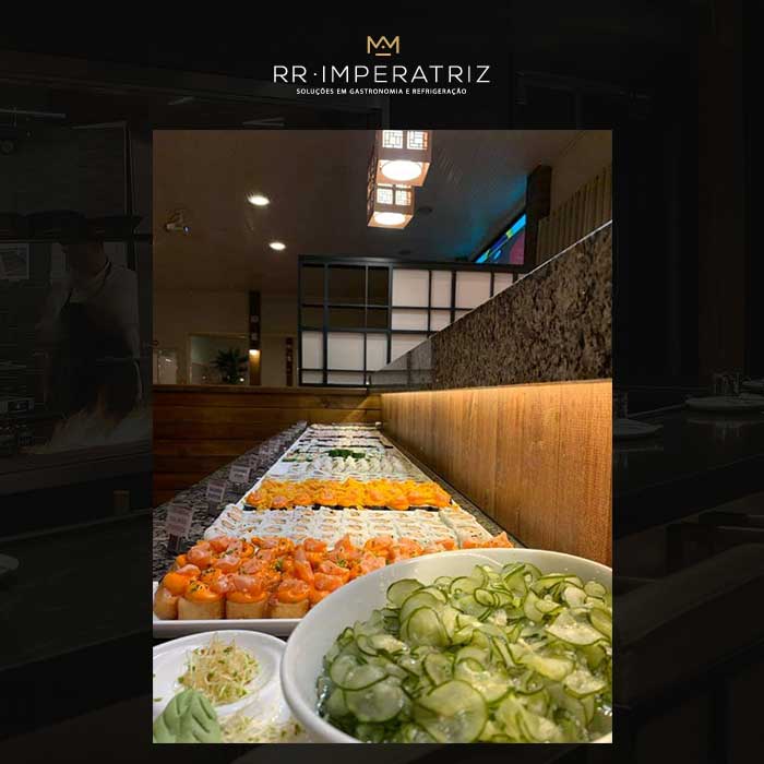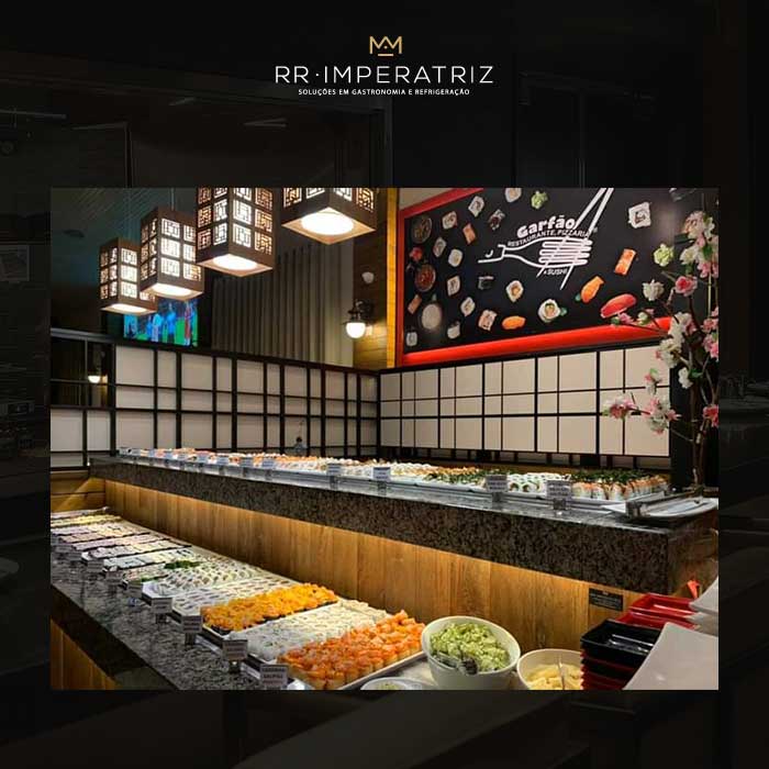 Buffet para sushi executado com estrutura de metalon revestido de MDF Western e granito Ocre Itabira, com mise en place para a refrigeração e manipulação dos peixes e condimentos.