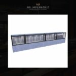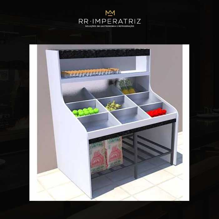 Esta fruteira em MDF cinza foi revestida com inox polido na parte interna, tem estrutura em metalon. Possui espelho e faixas de granito verde panorama.