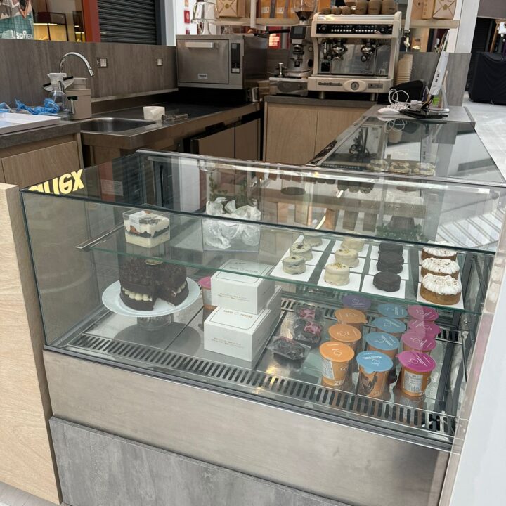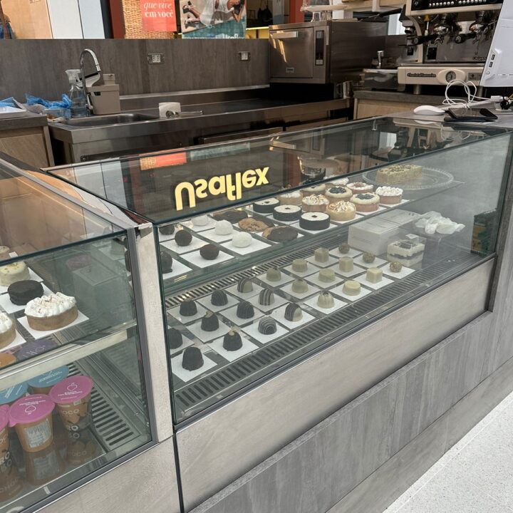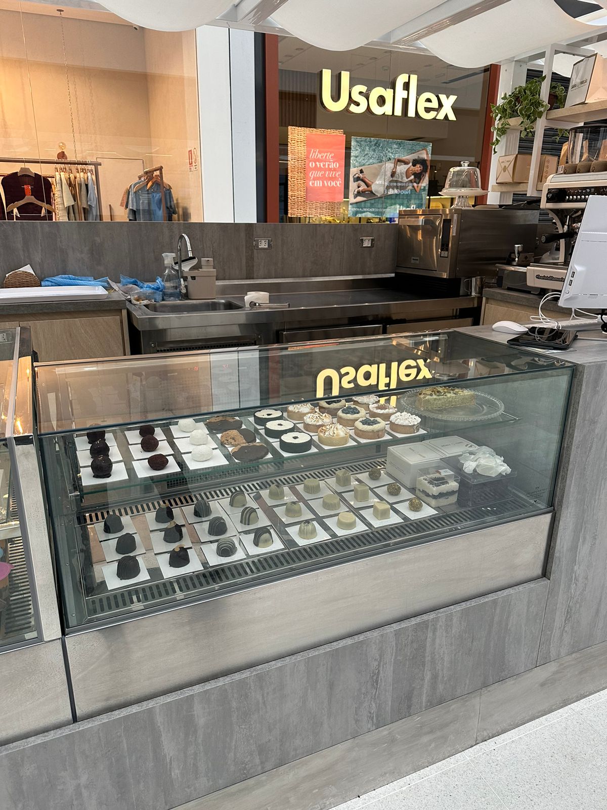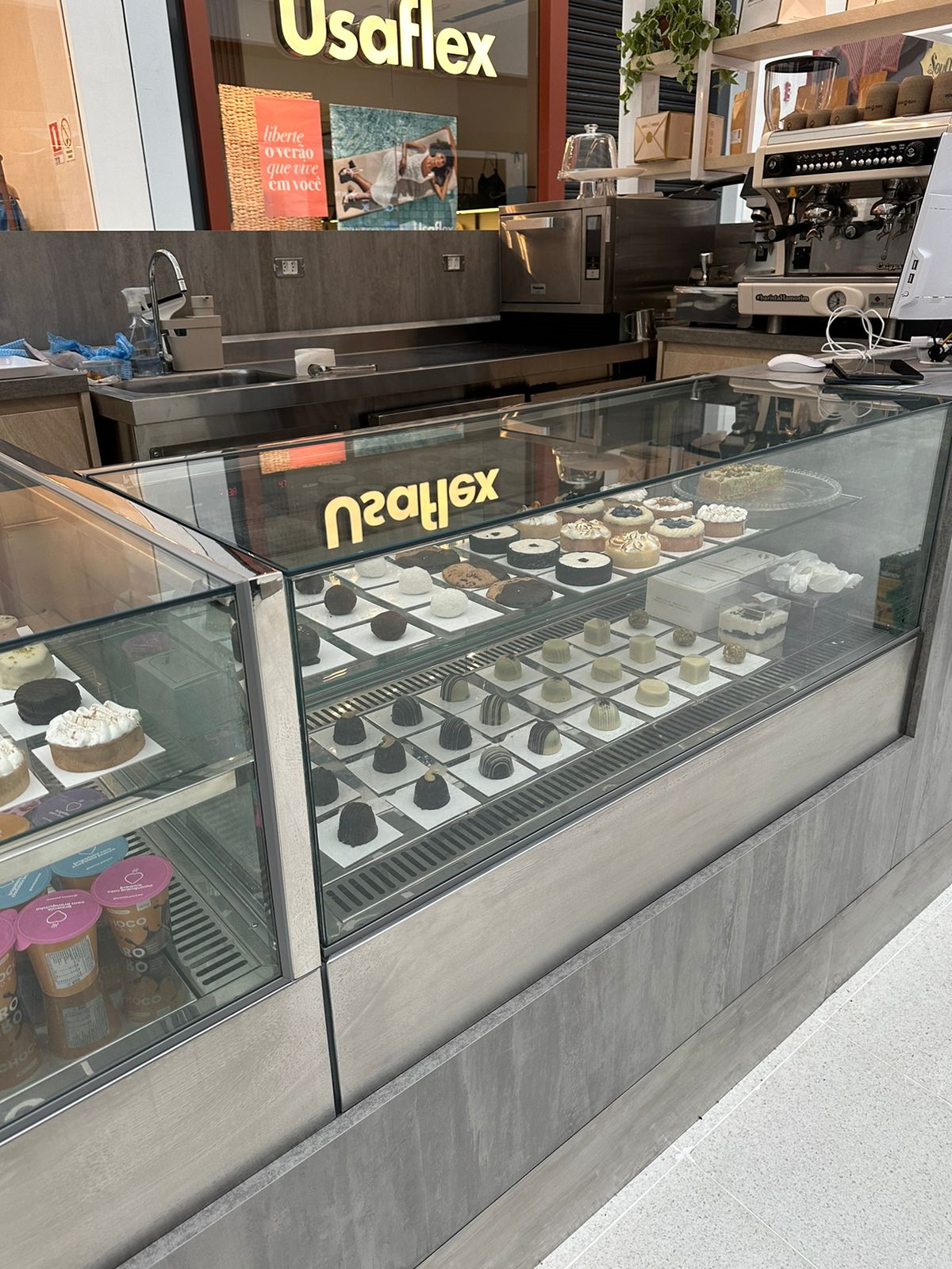Dispondo de espaço bastante resumido para atender as necessidades do cliente foram feitas vitrines bastante amplas na sua exposição aos produtos. Fornecendo uma disposição aos itens disponíveis de forma a não passarem desapercebidos por quem passa no corredor.