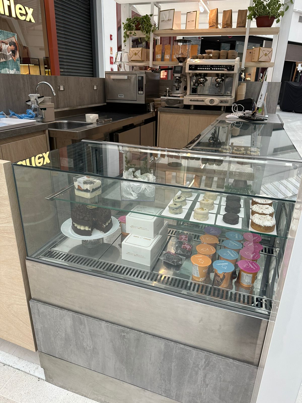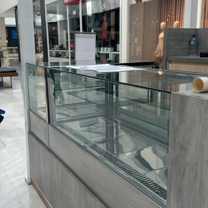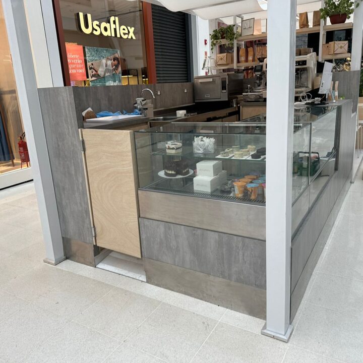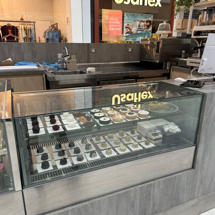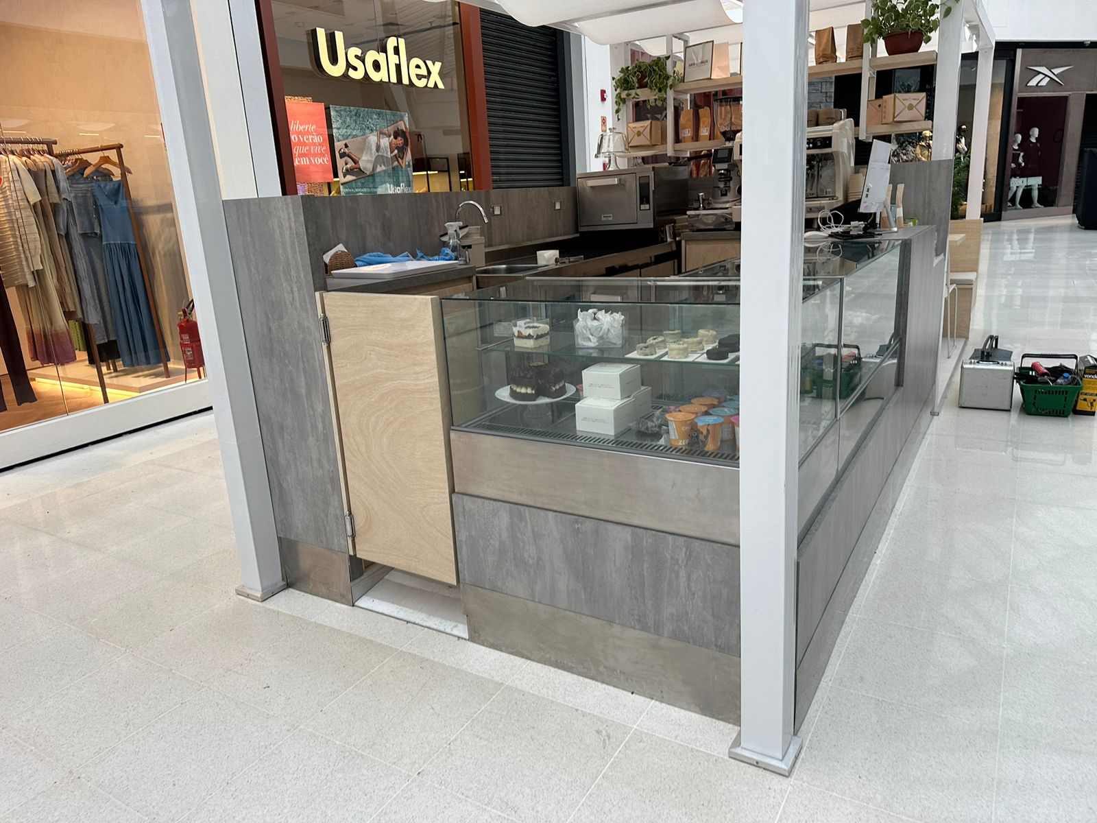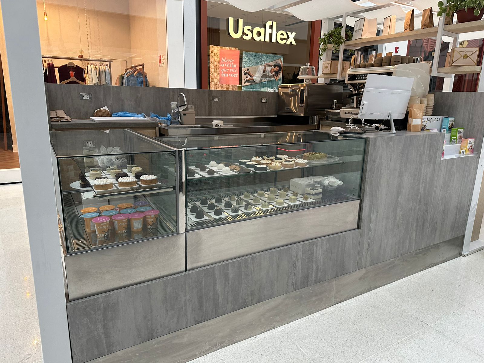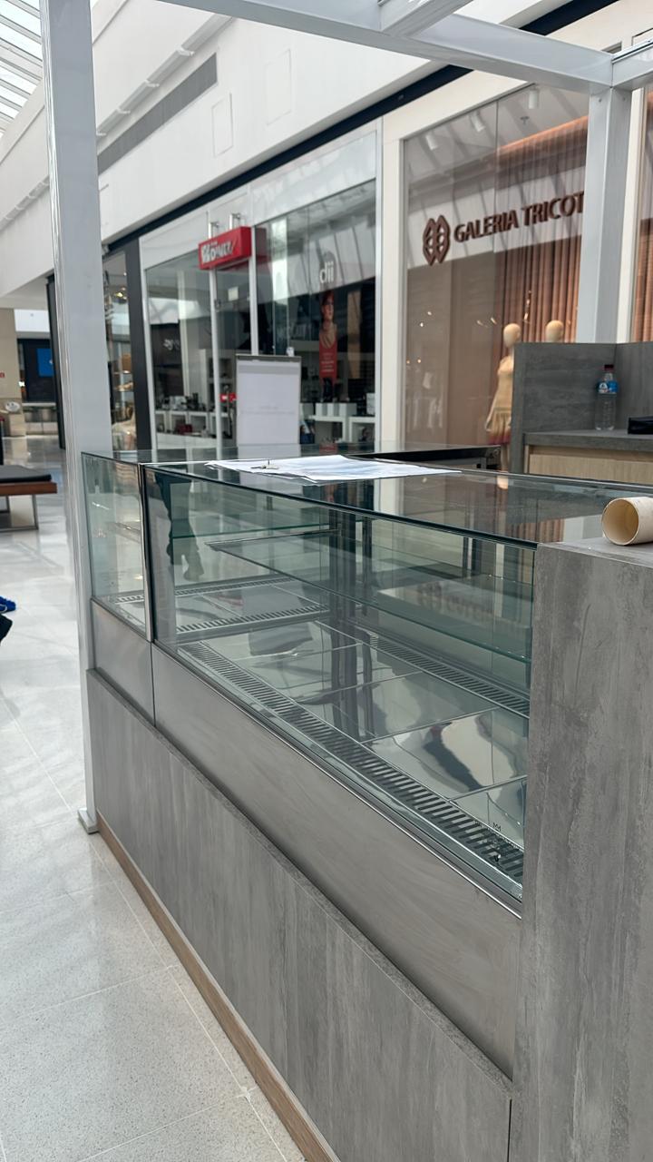 Projeto de Vitrines em marcenaria, inox e vidro. Recepcionam o público circulante, com forte oferta dos produtos e fácil acesso ao consumo.