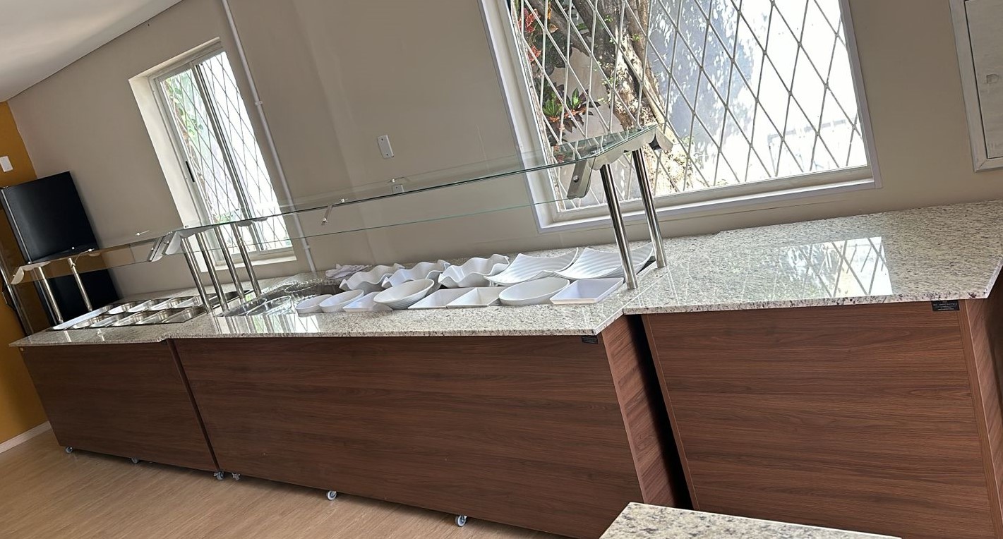 Conheça este buffet completo com espaços dedicados para pratos, saladas e banho-maria, feito com uma combinação elegante de MDF, granito e metalon! Ideal para valorizar o visual e a funcionalidade do seu negócio.