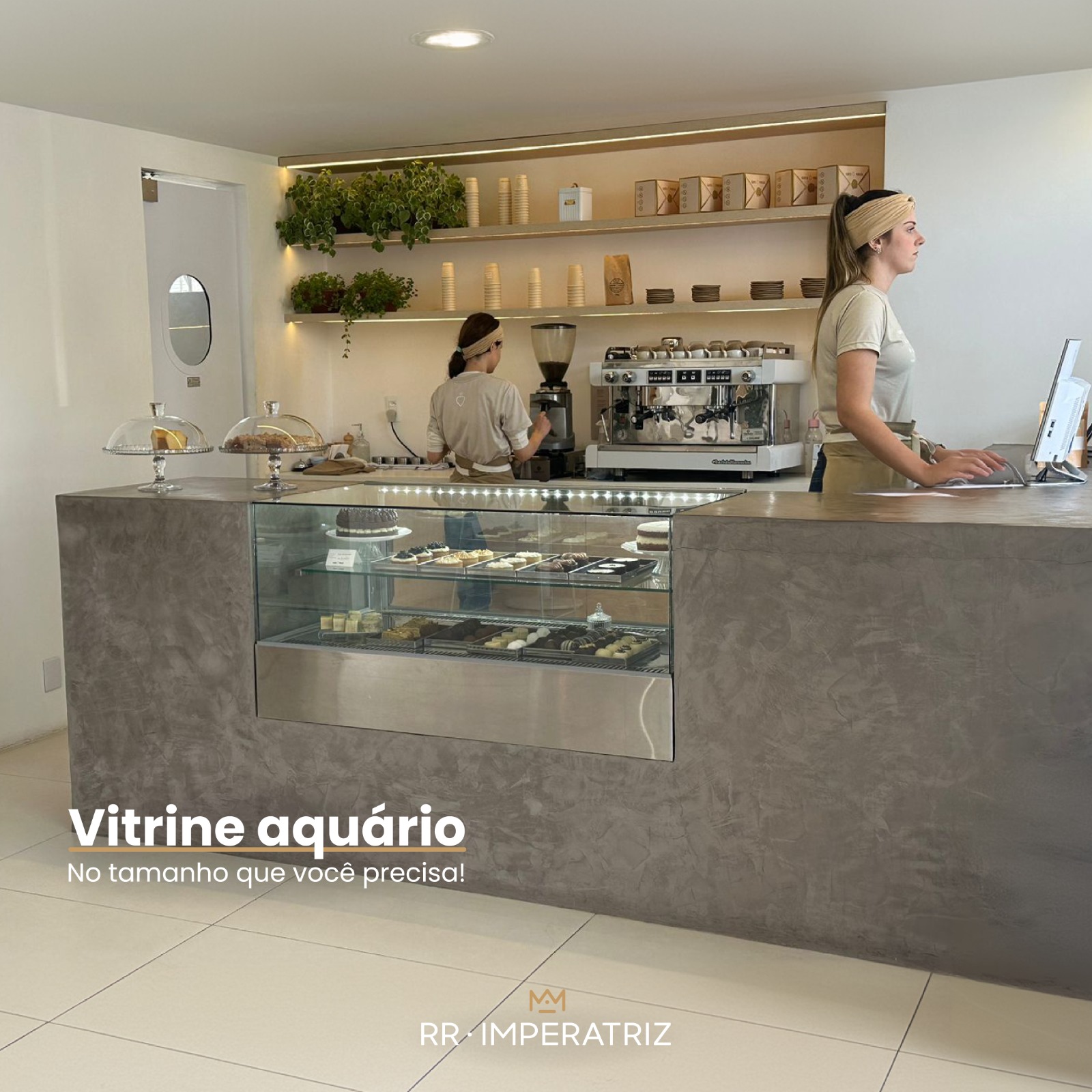 Vitrine aquário refrigerada em modelo personalizado. Projeto de Vitrine em inox e vidro. Forte oferta dos produtos e fácil acesso ao consumo.